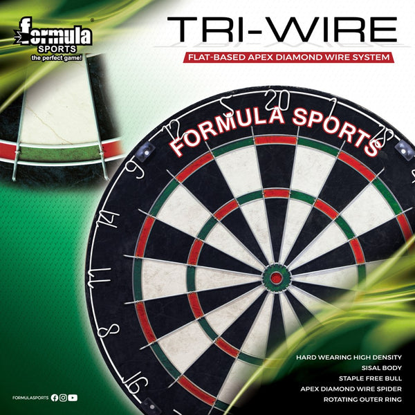 The Formula Sports Tri-Wire Dartboard is a new and improved triangular wire dartboard that features low profile steel staples and a completely staple free bullseye.