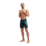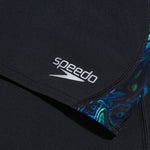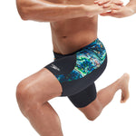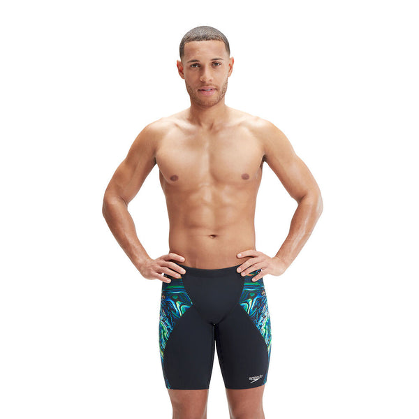 Nail your training in style wearing this sleek black Jammer, featuring a captivating green and blue marbled print with stunning shell-like iridescence. Designed to create a streamlined profile in the water, the jammer includes an adjustable drawstring waist and a v-cut panel with integral support for added comfort and security. Made from our durable Endurance+ fabric, it's quick-drying and 100% chlorine resistant. Plus, one of the yarns in this fabric is made from 100% post-consumer waste, such as recycled plastic bottles.