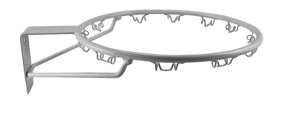 The Heavy Duty Netball Ring is a heavy duty ring that features a sleek powder-coated white finish and net hooks.
