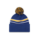 West Coast Eagles cuff knit beanie in blue features the teams official logo on the front and the Bombers team coloured stripes on the crown. The beanie also features flecked pom on the top and a New Era flag embroidered to the left hand side.