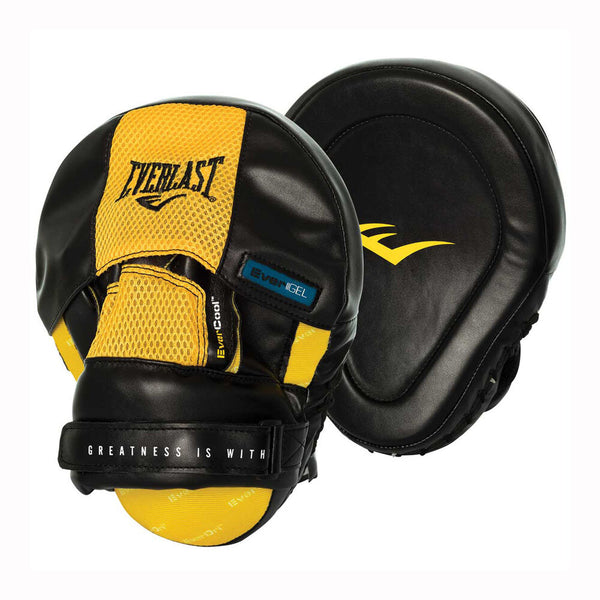 Train like a Pro when you partner up with the Everlast EverGel Precision Punch Mitts during your next sparring session. Built to counter high-performance punches, jabs and uppercuts, the EverGel palm ball and thick wrist strap provide impact reduction to protect your assets at each connection. The curved design allows for improved "catch" with every hit, allowing you workout partner to transition from blow to blow seamlessly. EverCool technology mesh allows hot air to escape to keep you cool while a hook and loop wrist strap locks you in for distraction-free training. Train better with the Everlast EverGel Precision Punch