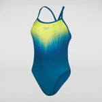 Power through your training in this standout digital print. Enjoy total freedom of movement as you fly through your set wearing this stunning Turnback swimsuit, featuring an ombre fade from fluo yellow to teal - reminiscent of the sun on the ocean. The thin-strap design allows unrestricted shoulder movement while the high-cut leg provides maximum flexibility during your swim. The suit is fully front lined for comfort and modesty. Designed to be durable and better for the environment, it's made from our new ECO Endurance+ fabric, which is 100% chlorine resistant, quick-drying and made using 50% recycled materials.