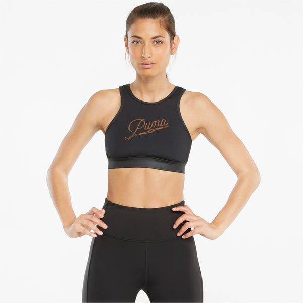 Who says you can't be glam while working up a sweat? This cute cropped top adds some power and punch to your workout, with a mesh racerback design for maximum flexibility and breathability, leather-effect edging and eye-catching metallic PUMA graphics across the front. Moisture-wicking dryCELL technology gives an extra high-performance edge to this super-stylish bra top, which expertly combines a cutting-edge look with a touch of vintage inspiration.